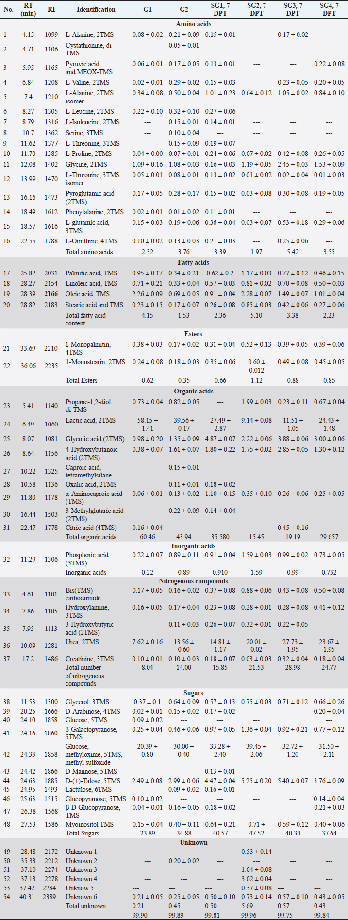 Fig. 1. PLS-derived score plots obtained by correlating GC-MS-derived serum metabolite profiles of the pneumonic sheep group (G2, green dots) and the pneumonic sheep groups treated with: Traditional therapy (SG 1), combined traditional therapy and silymarin 280 mg (SG 2), silymarin 280 mg (SG 3), and silymarin 560 mg (SG 4) to the tested biochemical markers (A) MDA, (B) TAC, (C) TG and LDL-cholesterol, (D) total and HDL-cholesterol, (E) kidney function tests (creatinine and urea), (F) blood glucose concentrations, and (G) liver activities (blood serum AST, ALT, GGT). Table 5. Serum metabolite percentile level based on gas chromatography/MS analysis.