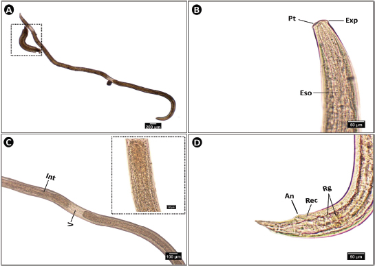 Fig. 4. Microphotograph of Anisakis sp. larvae collected from different organs of S. undosquamis. (A) Whole mount of the third-stage larva (×4), with the square indicating a newly hatched first-stage larva. (B) Lateral view of the anterior end (×40), showing a pointed tooth (PT), terminal lateral excretory pore (Exp), and esophagus (Eso). (C) Middle portion of the worm (×10), showing the tubular intestine (Int) and a lighter ventricle (V), enlarged in the inset. (D) Lateral view of the posterior end (×40), characterized by several rectal glands (Rg) and the rectum (Rec), which terminates laterally at the anus (An).