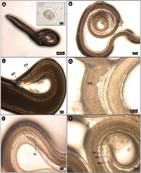 Fig. 5. Microphotograph of Contracaecum sp. larva collected from different organs of S. undosquamis. (A, B) Whole mount of the third-stage larva (A, ×4 & B, x10), with an inset showing an embryonated egg. (C) Lateral view of the anterior end (×40), showing the mouth (Mo) and esophagus (Eso). (D, E) Middle portion of the worm (×40), showing the intestine (Int) and ventricular appendix (Va). (F) Lateral view of the posterior end (×40), showing the external sheath (Sh) and rectum (Rec), which terminates laterally at the anus (An).