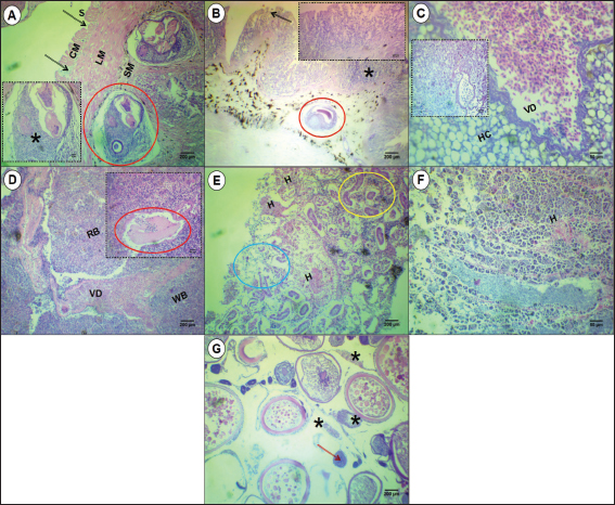 Fig. 8. Microphotographs of different organs of S. undosquamis infected with helminths. (A-B) Stomach and intestine sections, respectively (×10), Damage to the serosa (S) and circular muscle fibers (CM) is indicated by black arrows, whereas the longitudinal muscle fibers (LM) remain normal. Worms (red circles) were located in the submucosa (SM) of the stomach and within the intestinal villi, causing damage to the infected area (black arrow) and surrounded by cellular infiltration (*) as enlarged in the A and B insets (×40). (C) Liver section (×40) showing significant vasodilation (VD) and abnormal hepatocytes (Hc) compared to the control uninfected liver (C window). (D) Spleen section (×10) showing the two main compartments: red pulp (RP) and white pulp (WP). Vasodilation (VD) was the main lesion in the infected spleen. The D inset (×40) highlights a parasite (red circle) near the vasodilated area. (E) Kidney sections (×10) reveal hemorrhage (H), with some deformed tubular areas (blue circle) and others normal (yellow circle). (F) Testis sections (×40) with hemorrhage (H) in some areas. (G) Ovary sections (×10) exhibit malformations in the oocysts (red arrow) and cellular infiltration (*).