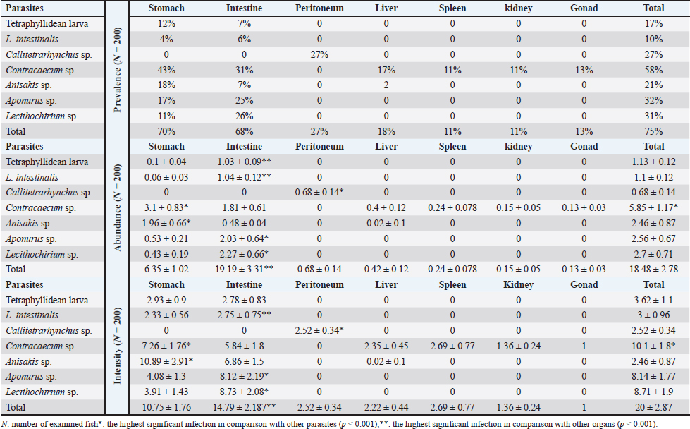 Contracaecum sp. was the only parasite recovered from all internal organs and was the dominant species. Its mean abundance and intensity were recorded at 5.85 ± 1.17 and 10.1 ± 1.8, respectively. These values were higher than the mean abundance (0.076) and intensity (0.15) of the same fish species reported by El-Asely et al. (2015).