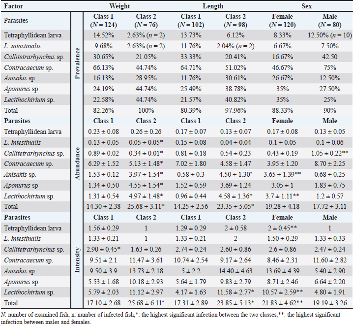 The prevalence was the highest (100%) in larger fish within class 2 (>113 g) than in smaller ones; 82.26% belong to class 1 (< 113 g). Contracaecum sp., Aponurus sp., and Lecithochirium sp. were the most prevalent worms in class 2, and the former only in class 1. The total abundance and intensity were significantly higher (p < 0.001) in larger S. undosquamis than in smaller fish (Table 2).