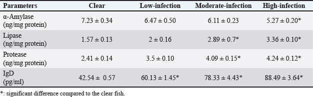Lipase and protease levels were significantly higher in moderately and highly infected samples than in uninfected ones (p < 0.02 and p < 0.001, respectively). In contrast, α-amylase activity was highest in uninfected fish (7.23 ± 0.34) and lowest in infected fish (5.27 ± 0.20). Similar to protease and lipase, IgD levels were significantly elevated in heavily infected fish compared to uninfected ones (Table 3).