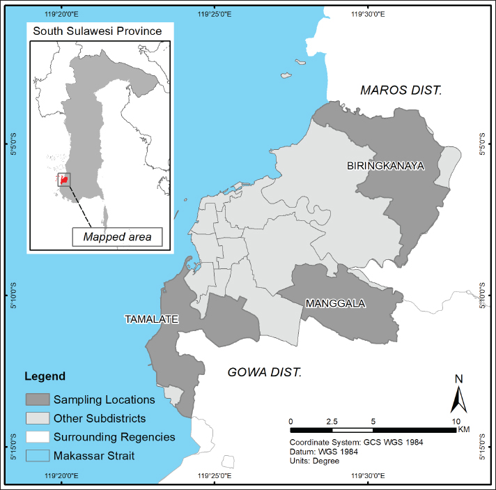 Fig. 1. Map showing the sampling locations in three urban subdistricts of Makassar City, South Sulawesi, Indonesia: Biringkanaya, Manggala, and Tamalate (Map vector Available via https://tanahair.indonesia.go.id).