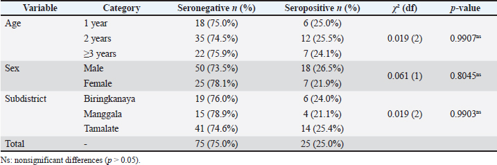 Results: Twenty-five goats were seropositive, yielding an overall prevalence of 25% (95% confidence interval: 17%–34c%). Seroprevalence did not differ significantly by age (24%–26%; χ²=0.019; p=0.99) or sex (male 26.5 % vs. female 21.9 %; χ²=0.061; p=0.80). Spatially, prevalence ranged narrowly—21.1% in Manggala, 24.0% in Biringkanaya, and 25.4% in Tamalate (χ²=0.019; p=0.99).