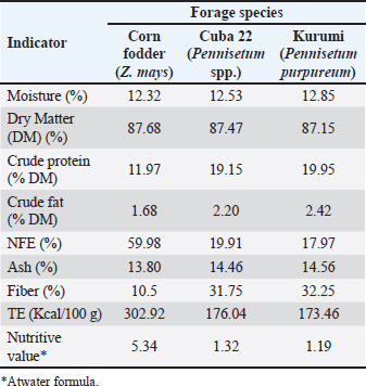 AbstractBackground: Improving the nutritional quality and productivity of guinea pigs is a priority in Peruvian livestock production, driving the search for sustainable feeding strategies. However, there is little evidence on the use of tropical grasses and their impact on the performance and carcass composition of Kuri guinea pigs. Aim: To evaluate the effect of three forage species on the productive performance and carcass nutritional value of Kuri guinea pigs. Methods: Forty-five weaned female guinea pigs, 15 days old, were randomly distributed into three treatments (15 animals per group): T1=corn fodder (Zea mays), T2=Cuba 22 (Pennisetum spp.), and T3=kurumi (Pennisetum purpureum). The forages were cultivated in the same experimental unit and chemically analyzed prior to the trial. Animals were housed individually and received the assigned forage plus a balanced concentrate. Feed intake, weight gain, and feed conversion ratio were recorded at 30, 45, 60, 75, and 90 days of age, respectively. At the end of the trial, the carcasses were analyzed for dry matter, moisture, protein, and fat content. Results: Guinea pigs fed with corn fodder showed higher weight gain (p < 0.05) than those fed with other treatments. However, no significant differences feed intake or feed conversion ratio were observed among the experimental groups. Regarding carcass composition, guinea pigs fed with kurumi grass showed significant differences (p < 0.05), with higher protein content and lower fat and moisture percentages compared with those fed corn fodder and Cuba 22. Conclusion: The corn fodder–based diet improved weight gain in Kuri guinea pigs; however, those fed with kurume grass exhibited better carcass nutritional quality. Keywords: Carcass, Feed conversion, Guinea pig, Weight gain, Tropical grass. IntroductionThe consumption of guinea pig meat (Cavia porcellus) is a deeply rooted tradition in Peru, especially in the Andean region. In recent years, national demand has grown, fostering the establishment of small- and medium-scale production enterprises. Similarly, countries such as Bolivia, Ecuador, and Colombia have maintained a long-standing preference for this product (Rosenfeld, 2008; Avilés et al., 2014; Donoso et al., 2025), forming a regional market with the potential to strengthen food security—particularly in rural and low-income areas—due to its ease of rearing and high nutritional value (NV) (Lammers et al., 2009; Sánchez-Macías et al., 2018). Moreover, recent studies report that guinea pig feces contain lactic acid bacteria with probiotic potential capable of improving productive indices and reducing pathogenic bacterial growth (Goicochea-Vargas et al., 2024), demonstrating its biotechnological and productive value. Despite these advantages, most research aimed at optimizing guinea pig production focuses on incorporating additives (commercial or natural probiotics) into balanced feed to improve feed conversion, weight gain, and meat safety (Cano et al., 2016; Guevara et al., 2016; Carcelén et al., 2021; Goicochea-Vargas et al., 2025). Other studies have evaluated the effects of non-conventional forages, such as Erythrina sp. or kudzu, and crop residues on weight gain and carcass quality (Cárdenas et al., 2018; Castro et al., 2018; Cuibin et al., 2020). However, studies addressing the use of tropical forages in feeding guinea pigs on the Peruvian coast remain scarce. In addition, the nutritional composition of guinea pig meat varies among breeds. For instance, the Perú breed contains 17.78% protein and 8.56% fat, whereas the Andina breed reaches 18.75% and 7.66% (Flores-Mancheno et al., 2017). These variations are likely related to the type of feeding system used (Herrera et al., 2022, 2024). To date, no information is available on the nutritional composition of Kuri guinea pig meat. Corn fodder is one of the most commonly used forages in guinea pig production as the main plant-based feed. However, because it is not a perennial grass and requires high labor input, its use is limited in certain areas. In recent years, perennial grasses such as kurumi and Cuba 22 have attracted attention owing to their high productivity and NV (Emile et al., 2018; Pinchao-Pinchao et al., 2024), although they are not yet widely used in guinea pig production. Currently, guinea pig meat production continues to be an important source of food and income for families in Latin America and Africa. In this context, the present study aimed to evaluate the productive parameters and carcass nutritional characteristics of female Kuri guinea pigs fed with corn fodder, kurume grass, and Cuba 22. Materials and MethodsStudy site and period of studyThe research was conducted at the “Bodegones” guinea pig farm in the province of Lambayeque (6°42′S, 79°54′W), northern Peru. This area has two well-defined seasons: autumn (April–November), with an average temperature of 19°C and relative humidity of 82%, and summer (December–March), with an average temperature of 33°C and relative humidity of 68%. The experimental phase with the animals was conducted from February to May 2025, while the forage cultivation and chemical analyses were conducted in the months preceding the trial. Cultivation and proximate forage species analysisThree forage species were used: corn fodder (Zea mays), Cuba 22 (Pennisetum spp.), and kurume (Pennisetum purpureum). These were planted in cultivation fields belonging to the same facility where the animal phase was conducted. Specific agronomic care was provided for each species in accordance with previous studies. Each pasture was planted at different times to ensure homogeneous cutting age at the moment of consumption, minimizing potential bias caused by nutritional variability due to forage maturity. The pastures were harvested according to scientific literature. Corn fodder was provided when the maize kernel was at the milky stage (approximately 75 days after planting) (Salama, 