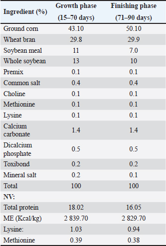 Study design, animals, and variablesThe study was experimental with a quantitative approach, employing a completely randomized design. A total of 45 15-day-old weaned female guinea pigs belonging to the Kuri breed and with similar body weights were used. Animals were randomly assigned to three treatments: T1=corn fodder (Zea mays), T2=Cuba 22 (Pennisetum spp.), and T3=kurume (Pennisetum purpureum). The sample size was determined based on a power analysis for a one-way analysis of variance (ANOVA) design (α=0.05). With this number of animals, the estimated statistical power to detect a large effect (Cohen’s f=0.40) was approximately 0.64, while achieving a power of 0.80 would require approximately 21 animals per group. Therefore, for ethical and logistical reasons, 15 animals per group were used—insufficient to detect large differences among treatments while ensuring responsible use of animals. The animals were housed individually, with each serving as an experimental unit. To meet the nutritional requirements, a daily supply of 200 g of forage corresponding to the assigned treatment was provided, along with a uniform ration of balanced feed (50 g/animal) across all groups (Table 2). The guinea pigs had ad libitum access to water via nipple drinkers. Table 2. Ingredients used in the formulation of the balanced feed and NV of rations used as a dietary supplement for all guinea pigs during growth and finishing phases.