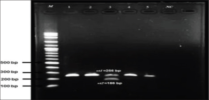 Fig. 1. Shows the results of multiple PCRs. PCR amplification product for E. coli isolates for Vt1 gene (1,2,3,4,5) at 256 bp Vt2 genes (3) at 185 bp, M=ladar, (6) –Ve results. Table 4. The results of culture and microbial characterization tests for the detection of E. coli producing Vero cell toxin for E. coli progeny in meat samples in PCR.