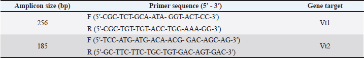 Open Vet. J.. 2025; 15(12): 6230-6236 Open Veterinary Journal, (2025), Vol. 15(12): 6230-6236 Research Article Molecular detection of Escherichia coli producing Vero cytotoxic toxin in red and white meat available in local Syrian marketsAbdul Aziz Arawneh1, Ghiyath Soliman2 and Ammar Haji Al-Ali1*1Department of Public Health and Preventive Medicine, Faculty of Veterinary Medicine, University of Hama, Hama, Syria 2Faculty of Medicine, Department of Family and Community Medicine, University of Tartous, Tartous, Syria *Corresponding Author: Ammar Haji Al-Ali. Department of Public Health and Preventive Medicine, Faculty of Veterinary Medicine, Hama University, Hama, Syria. Email: ammmmar19994 [at] gmail.com Submitted: 21/07/2025 Revised: 01/11/2025 Accepted: 11/11/2025 Published: 31/12/2025 © 2025 Open Veterinary Journal