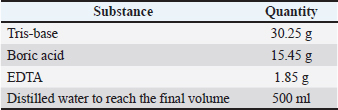 -It was obtained from TaKaRa Company of Japan (Cod No. RR01AM). This kit contains DNA polymerase TaKaRa EX, TaqTM 10X, EX TaqTM Polymerase Reaction Buffer mg+2 free, 2525M MgCl2 salt, and a mixture of the four nitrogenous bases (dNTP: A/C/G/T). -Sterile DNA-free sterile distilled water: Used in the DNA-Extraction stage as well as in the PCR reaction mix preparation stage. -Agarose: It is obtained from PeqGold Universal Company (lot N O2) and used to prepare a 1.5% agarose gel to detect reaction products amplified in PCR by electrophoresis as shown in Table 2. Table 2. Components of the TBE gel electrophoresis buffer. Tris-borate-EDTA (TBE-1X) TBE.
