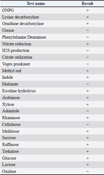 Statistical studyPearson's chi-square method was used for statistical analysis in SPSS 20. Ethical approvalEthical approval was provided by the Faculty of Veterinary Medicine, Hama University, Syria. ResultsResults of the bioassaysThe results of the confirmatory biochemical tests were read using the KB003 Hi25 Enterobacteriaceae diagnostic system for E. coli, where the results were read with reference to the standard tables for each test to confirm the identity of the bacterial isolate, and Table 3 shows the results of the confirmatory biochemical tests for E. coli isolates. Table 3. Shows the results of the biochemical tests.