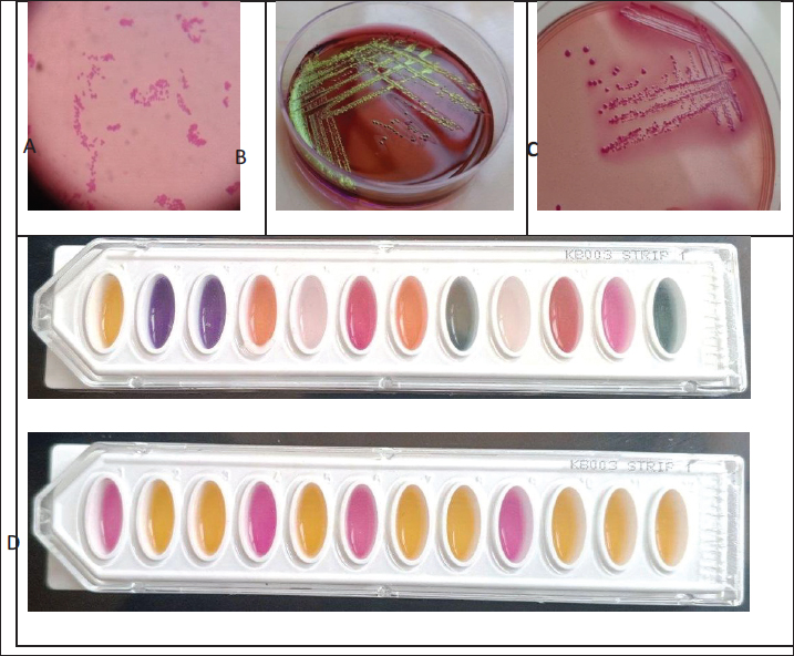 Fig. 1. Isolation and biochemical characterization of Escherichia coli. A) Gram staining: Escherichia coli is a Gram-negative bacterium. B) Culture on EMB agar: E. coli produces greenish colonies with a distinctive metallic sheen on EMB agar. C) Culture on MacConkey agar: E. coli appears as pink colonies on MacConkey agar because of its ability to ferment lactose. D) Biochemical testing: Biochemical reactions were observed using the Hi25™ Enterobacteriaceae Identification Kit (KB003), which provides a profile for accurate identification. Table 4. Prevalence of virulence genes in diarrheic calves’ E. coli isolates.