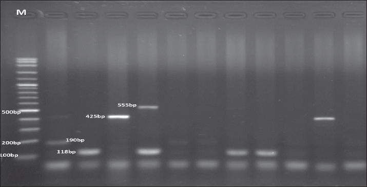 Fig. 4. Agarose gel electrophoresis product of multiplex PCR for the presence of stx1 (555 bp), stx2 (118 bp), eaeA (425 bp), and sta (190 bp) genes in different E. coli strains. Lane M: 100 bp ladder as a molecular size DNA marker. Table 5. Antibiotic susceptibility profile of E. coli isolates.