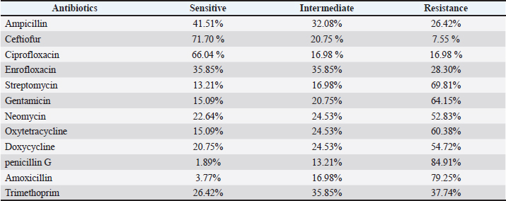 The study revealed the antibiotic resistance patterns among the tested isolates. Resistance rates were highest for penicillin G (84.91%) and amoxicillin (79.25%). Conversely, the most effective antibiotics showed susceptibility rates of cefquinome (71.70%) and ciprofloxacin (66.04%) (Table 5 and Fig. 3). DiscussionOur results demonstrate a remarkably high prevalence of virulence genes among E. coli isolates, occurring both individually and in various combinations of hybrids. These findings substantially exceed the rates reported by Ibrahim (2012) in Syrian cattle farms, where only 6% of isolates carried sta genes, 14% possessed Stx1/Stx2 genes, and 1.33% harbored the eae A gene. More recent data from Cabrera-González et al. (2024) revealed an even more complex virulence profile, 83.15% prevalence of sta genes, 1.05% for stx2, and 21.05% for eae. Notably, we observed significant frequencies of hybrid pathotype combinations EAEC/ETEC (44.21%), STEC/EAEC (3.15%), EPEC/ETEC (2.10%), STEC/EAEC/ETEC (21.05%), EPEC/EAEC/ETEC (6.31%), and EPEC/STEC/EAEC/ETEC (7.36%). Ok et al. (2009) investigated diarrheagenic E. coli in calves and reported sta gene 18.9%, Stx1 gene 13.5%, Stx2 gene 5.4%, and eae gene 8.1%. Nguyen et al. (2011) subsequently identified stx1 alone, 13.3% stx2 alone, 21.2%, and co-occurrence of stx1/stx2, 16.8%. They found substantially lower rates for the sta gene 0.6%, the eae gene 9.8%, and the eae/stx combination 6.7%. More recent data from Cengiz and Adigüzel (2020) revealed stx1 3.03%, stx2 9.09%, sta 21.21%, and eae 15.15%. Their pathotype distribution showed that ETEC was predominant (51.5%), EPEC (15.2%), EHEC (6.1%), and STEC/EHEC hybrid (12.1%). The widespread prevalence of pathogenic E. coli strains observed in this study may be attributed to the absence of E. coli vaccination in the geographical area where the research was conducted, in addition to the presence of some of these virulence genes in phages and plasmids, which facilitate horizontal gene transfer and the emergence of hybrid strains. The observed variations between our findings and those of previous studies may be attributed to differences in geographical regions, the epidemiology of pathogenic E. coli strains, and breeding types and feeding practices. The emergence of AMR stems from genetic modifications through multiple mechanisms, including spontaneous mutations in chromosomal DNA, horizontal gene transfer of resistance determinants via conjugation (plasmid-mediated), transduction (phage-mediated), and transposons (mobile genetic elements) (Normark and Normark, 2002). The findings revealed that E. coli bacteria causing calf diarrhea exhibit widespread resistance to antibiotics. In comparison with previous research, numerous studies have also indicated broad resistance in E. coli isolates from diarrheic calves. Cengiz and Adigüzel (2020) found that the highest resistance rates were to oxytetracycline (78.9%), trimethoprim-sulfamethoxazole (60.9%), and neomycin (58.6%). In contrast, the highest susceptibility rates were to ceftiofur (92.5%), cefoperazone (90.2%), and cefuroxime (90.2%). Paul et al. (2010) discovered that E. coli isolates from diarrheic calves were highly sensitive to enrofloxacin and ciprofloxacin, showed moderate sensitivity to cephalexin and amoxicillin, but were resistant to nalidixic acid and erythromycin. Bok et al. (2015) isolated E. coli from diarrheic calves. These isolates showed the highest resistance rate to neomycin (51%) and the lowest resistance rate to norfloxacin (0.7%). The isolates from cattle showed the highest resistance rate to neomycin (24.6%) and the lowest resistance rate to cefapirin (0.8%). Li et al. (2018) observed that E. coli strains exhibited varying degrees of resistance to 19 commonly used antibiotics, particularly tetracycline, cephradine, doxycycline, carbenicillin, ampicillin, ciprofloxacin, and norfloxacin. Resistance rates for these drugs exceeded 40%, with tetracycline resistance being the most common at 53.7%. No strains showed resistance to neomycin or polymyxin B. Antibiotic resistance in E. coli could also arise from the irresponsible use of antibiotics, the use of multiple antibiotics without testing their efficacy, and the non-completion of treatment. These actions tend to cause bacteria to develop resistance to the applied antibiotics. The discrepancy between the results of this study and previous studies may be attributed to differences in treatment methods and the commonly used medications for managing animal diseases. ConclusionPathogenic E. coli strains are among the most significant causes of diarrhea in calves. These pathogens also represent a zoonotic concern, as they can transmit and infect humans. Extensive resistance to multiple antibiotics poses a major public health threat because multidrug-resistant strains in animals pose a potential hazard to human health. Consequently, E. coli infection treatment must be guided by antibiotic sensitivity testing results. In addition, we recommend limiting the indiscriminate use of antibiotics and conducting more research on the dissemination of pathogenic Escherichia coli strains among animal and human populations. AcknowledgmentsNone. Conflict of interestThe authors declare no conflict of interest. FundingThe main funder of this research is the University of Hama, which provided the laboratories in which the research was conducted. Authors’ contributionsASEEM ALBAKER is the primary researcher, implementer, and writer of the research, as this research is part of the doctoral thesis that is currently being prepared. Dr. MAHER SALEH supervises the research as a scientific supervisor and assistant in directing and writing the thesis, and Dr. ASHRAF ALSALEH is the assistant practical supervisor during the implementation of the research. Data availabilityAll data are provided in the revised manuscript. ReferencesAltaweel, H. and Aldaoud, F. 2023. Investigation of E. coli K99 and rotaviruses causing