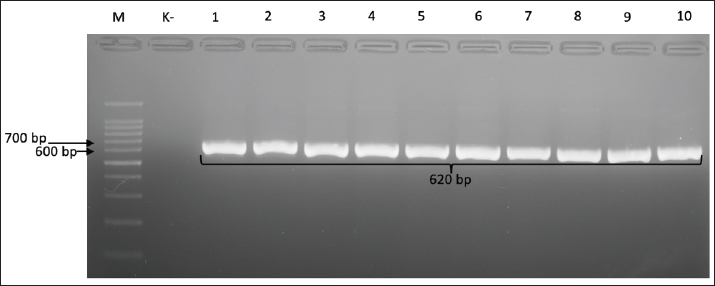 Fig. 2. Gel electrophoresis results for cdtB gene detection (620 bp). Note: Lanes: M, 100-bp marker; K-, control negative; 1-10, representative of Campylobacter jejuni isolates. The presence of the cdtC gene, which also functions as a binding subunit, was confirmed by the presence of a 182-bp PCR product (Fig. 3).