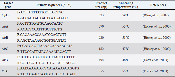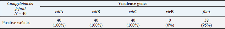 Confirmation of the C. jejuni species was performed using conventional PCR to detect the hipO gene, which is a specific gene for C. jejuni. The primer details and cycling conditions are explained in Table 1. The PCR master mix contained 5 μl DNA template, 1 μl each primer, 0.5 μl nuclease-free water, and 12.5 μl PCR master mix (Promega, USA) containing Taq DNA polymerase, dNTPs, MgCl2, and reaction buffer. The final volume of the reaction mixture was 20 μl. The amplification program consisted of primary denaturation at 95°C for 0.5 minutes and 35 cycles with secondary denaturation at 95°C for 0.5 minutes, annealing for 0.5 minutes, extension for 0.5 minutes at 72°C, and final extension for 7 minutes at 72°C. Table 1 lists the annealing temperature and used primer set (Wang et al., 2002). This test also includes positive (K+) and negative (K−) control. The amplification products were analyzed by 1.5% agarose gel electrophoresis (Invitrogen, USA), stained with RedSafe Nucleic Acid Staining Solution gel dye (Intron, South Korea), and documented with a UV transilluminator. Confirmed C. jejuni isolates were characterized for in vitro virulence gene detection by PCR for five known virulence genes: cdtA, cdtB, cdtC, virB, and flaA. The amplification program consisted of 35 cycles of denaturation at 95°C for 1 minute, annealing for 1 min, and elongation for 1 min at 72°C (Gharbi et al., 2022). Table 2 lists the annealing temperature for each gene and the primer sets used. Table 2. Prevalence of virulence genes in Campylobacter jejuni.