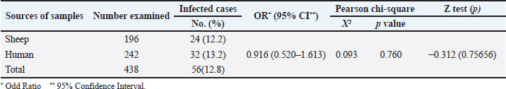 AbstractBackground: Chlamydia abortus (C. abortus) remains a notable zoonotic pathogen that is primarily responsible for abortion in sheep and goats. Despite its veterinary and zoonotic concerns. Aim: This study aimed to assess the prevalence of C. abortus in humans and animals in northern and coastal Egypt and the associated risk factors. Methods: A total of 196 blood samples of apparently healthy and aborted sheep were collected from different herds in three Egyptian governorates. A total of 242 blood samples were collected from women with a history of abortion admitted at El Shatby Hospital in Alexandria, Egypt. The collected samples were serologically tested for specific anti-C. abortus antibodies using an enzyme-linked immunosorbent assay employing the major outer-membrane protein peptide followed by the investigation of various risk factors. Results: Chlamydia abortus Immunoglobulin G (IGg) antibodies could be detected in 12.2% of the sheep examined. Five sociodemographic characteristics were significantly associated with anti-C. abortus IgG antibody positivity in sheep: breed (X2=27.543; p=0.000), governorate (X2=33.564; p=0.000), breeding system (X2=24.298; p=0.000), pregnancy status (p=0.003), and history of abortion (p=0.000). On the other hand, anti-C. abortus IgM antibodies could be detected in the sera of aborted women at a rate of 13.2%. By conducting a Pearson chi-square, a statistically significant association was detected between the infection in aborted women and residence (X2=27.428; p=0.000), contact with sheep (X2=77.744; p=0.000), history of miscarriage (X2=22.044; p=0.000), and time of miscarriage (X2=54.550; p=0.000). Conclusion: To the best of our knowledge, this study is the first to address the seroprevalence of C. abortus in humans and the potential risk factors associated with exposure in northern and coastal Egyptian regions. Furthermore, it provides an updated overview of this zoonotic pathogen’s seroprevalence among sheep in Northern Egypt. Keywords: Chlamydia abortus, Aborted women, Sheep, Risk factors. IntroductionChlamydia abortus (formerly, Chlamydia psittaci serovar 1) is a Gram-negative, obligatory intracellular bacterium. This pathogen has several reservoirs, including sheep, goats, and other livestock. It is one of the most common abortive agents in sheep and the leading cause of enzootic abortion of ewes or ovine enzootic abortion, with a global distribution (Longbottom et al., 2013; Hireche et al., 2016; Tejedor-Junco et al., 2019). Furthermore, it represents a potential zoonotic risk for susceptible veterinarians, workers, farmers, and pregnant women (Longbottom and Colter, 2003; OIE, 2018). This pathogen shares a unique biphasic developmental cycle with all Chlamydiaceae species (Borel et al., 2018a). The placenta, fetuses, and uterine discharge of aborted animals are the primary sources of C. abortus, which tends to transmit the infection orally and nasally to unimmunized sheep, farmers, and veterinarians (Hireche et al., 2016; Mamlouk et al., 2020). Conversely, humans can contract the disease by improperly handling placenta and postpartum secretions, inhaling infective aerosols after contact with infected animals or secondary contaminated environments, or by consuming contaminated food. The clinical profile of C. abortus infection in sheep includes stillbirth, the delivery of weak lambs that die after 48 hours, and abortion, which typically occurs in the last 2–3 weeks of pregnancy. Infected sheep have also exhibited other clinical signs, such as orchitis, pneumonia, encephalomyelitis, enteritis, conjunctivitis, and seminal vasculitis (Öztürk et al., 2016; Arif et al., 2020; Zhang et al., 2020). Although ewes that are aborted due to C. abortus are thought to be immune, this protection does not stop infected ewes from shedding bacteria, and the animals may remain persistently infected. This route represents the most significant source of infection in naive animals. They may also abort in the next lambing season (Essig and Longbottom, 2015). The spread of this enzootic infection to humans represents another critical issue. Although C. abortus infection in humans usually presents as a mild influenza-like illness (Rodolakis and Mohamad, 2010), some health issues have been identified, such as urethritis in men, spontaneous miscarriage, stillbirth, septicemia, or pelvic inflammatory disease in women (Longbottom et al., 2013; Essig and Longbottom, 2015). Chlamydia abortus is found in humans worldwide, with notable prevalence across North America, South America, Europe, Africa, and various regions across Asia and Oceania. According to the Centers for Disease Control and Prevention, 2.8 million people contract the disease annually in the United States alone, with reported infection rates increasing from 35.2 to 332.6 cases per 100,000 people between 1986 and 2005. According to recent reports on disease surveillance and emerging threats in the UK, C. abortus was the primary infectious agent causing fetal illness and reproductive problems in 2021–2022 and the second in 2023 (Nogarol et al., 2024). Increased screening and more accurate diagnosis methods may have contributed to this increase (Barrett and Stanberry, 2009). Regarding the occurrence of C. abortus infection in sheep, it has been recorded in numerous countries in the Middle East and disseminated worldwide, causing severe financial losses to sheep flocks. The seroepidemiological studies revealed prevalence rates of ovine chlamydiosis as 7.5% in Saudi Arabia (Aljumaah and Hussein 2012), 58% in Tunisia (Mamlouk et al., 2020), and 13.7% in Egypt (Selim et al., 2021). The presumptive clinical diagnosis of chlamydiosis is undoubtedly challenging due to the lack of distinct clinical features for C. abortus and the possibility of coinfection with other abortifacient etiological agents (Ababneh et al., 2014). Various serological techniques have been validated as sensitive and specific methods f