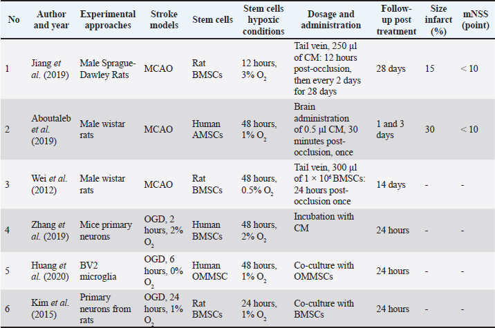 Open Vet. J.. 2026; 16(1): 41-55 Open Veterinary Journal, (2026), Vol. 16(1): 41-55 Review Article Preclinical studies of conditioned medium of hypoxic-preconditioned mesenchymal stem cell/hypMSC-CM for ischemic stroke: A systematic reviewRatih Rinendyaputri1,2, Uly Alfi Nikmah1, Novaria Sari Dewi Panjaitan1, Putri Reno Intan1, Jiro Hasegawa Situmorang1, Hasta Handayani Idrus1, Rilianawati Rilianawati3, Wireni Ayuningtyas4, Rachmawati Noverina4, Fathul Huda5 and Ahmad Faried6*1Center for Biomedical Research, Research Organization for Health, National Research and Innovation Agency, Bogor, Indonesia 2Doctoral Program, Faculty of Medicine, Universitas Padjadjaran, Bandung, Indonesia 3Research Center for Vaccine and Drugs, National Research and Innovation Agency (BRIN), PUSPIPTEK, Tangerang Selatan, Indonesia 4Bio Farma Stem Cell Research and Development, Bandung, Indonesia 5Department of Biomedical Sciences, Faculty of Medicine, Universitas Padjadjaran, Sumedang, Indonesia 6Neurosurgery Department, Faculty of Medicine, Universitas Padjadjaran, Bandung, Indonesia *Corresponding Author: Ahmad Faried. Neurosurgery Department, Faculty of Medicine, Universitas Padjadjaran, Bandung, Indonesia. Email: ahmad.faried [at] unpad.ac.id Submitted: 26/08/2025 Revised: 11/11/2025 Accepted: 30/12/2025 Published: 31/01/2026 © 2025 Open Veterinary Journal
