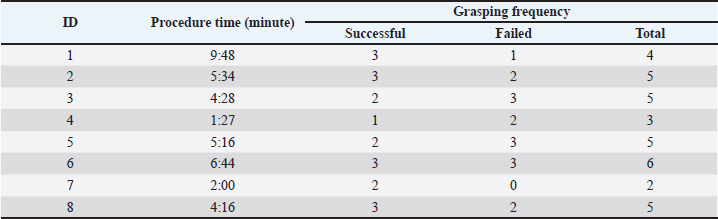 Ethical approvalNot needed for this study. ResultsThe procedure was performed without difficulty. None of the samples exhibited evidence of complete colon perforation. The intestinal segment was easily inflatable, and the lumen was clearly visualized. The rectal mucosa appeared rosy pink, shining, and had a longitudinally folded appearance. On the other hand, the colon lumen appeared cylindrical-shaped, glistening, and had a smooth surface (Fig. 1). The mean procedure time (including both successful and failed trials) was 4:56 minutes. A total of 19 tissue specimens were successfully collected from the colon samples. In each sampling procedure, the colon mucosa tended to slip out from the biopsy punch, especially when a small chunk of tissue was grasped.