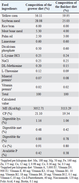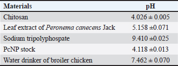 AbstractBackground: Peronema canescens Jack (P. canescens) leaves contain phenols, tannins, flavonoids, and saponins with antibacterial, antioxidant, and growth-promoting activities. However, their lipophilic nature limits their absorption in broilers. Chitosan-based nanoencapsulation is used to enhance the effectiveness of the extract when administered through drinking water. Aim: This study aimed to investigate the effects of nanoencapsulated P. canescens leaf extract (PcNP) administered through drinking water on the growth performance, carcass traits, digestive characteristics, and jejunum histomorphometry of broiler chickens. Methods: This study used a completely randomized design with six treatments, each of which was replicated six times. A total of 288 male Indian River broiler chickens were reared from day 1 to day 28. The treatments were as follows: negative control (no treatment); T1 (8.5 ml/l PcNP); T2 (17 ml/l PcNP); T3 (34 ml/l PcNP); T4 (68 ml/l PcNP); and positive control (25 mg/l zinc bacitracin) in drinking water. Results: PcNP supplementation in broiler chickens consistently improved feed efficiency by 1.42 and carcass percentage at concentrations ranging from 17 to 68 ml/l with 72.74%, 72.54%, and 74.14% (p < 0.05). Feather free weight (1,503.66 g), carcass yield (1,339.00 g), breast yield (520.50 g), upper thigh yield (215.50 g), and ileum length (89.66 cm) were increased in broiler chickens supplemented with 68 ml/l PcNP (p < 0.05). Abdominal fat weight and percentage decreased without PcNP supplementation but increased with supplementation of zinc bacitracin (p < 0.05). A dose of 8.5 ml/l PcNP significantly increased villus height (1570.26 μm) and villus height-to-crypt depth (12.00) (p < 0.005), whereas all doses reduced villus width, apical width, and crypt depth in broiler chickens (p < 0.001). Conclusion: These findings suggest that PcNP may have potential as a natural growth promoter in broiler production due to its beneficial effects on improving feed efficiency, carcass traits, and intestinal health. Keywords: AGPs replacement, Broiler chickens, Drinking water, Nanoencapsulation, Peronema canescens Jack. IntroductionGlobal poultry meat production and consumption have shown a consistent upward trend, serving as a primary driver of global meat production growth. By 2034, poultry meat consumption is projected to reach approximately 173 million tons (ready-to-cook basis), representing approximately 62% of the total increase in global meat consumption (OECD/FAO, 2025). The selection of the most superior genetic traits over the past few years has led to the production of high-quality poultry breeds. One key factor in improving broiler production is the maintenance of a healthy gastrointestinal tract, which directly impacts growth performance (Ducatelle et al., 2023). Traditionally, one of the most common approaches to support gastrointestinal tract health has been the use of antibiotic growth promoters (AGPs). AGPs inhibit pathogen growth through their strong antibacterial effect, thereby preventing subclinical infections (Uehara et al., 2023). The suppression of pathogenic bacteria enhances nutrient availability for the host organism, thereby improving the overall growth efficiency. However, growing global concern over antimicrobial resistance has highlighted the use of AGPs in livestock production as a critical issue, due to their role in fostering a resistant microbial population (Paul et al., 2022). The long-term use of subtherapeutic antibiotic doses can lead to the selection of resistant bacterial strains, which may spread to the environment and humans through the food chain (Zamanizadeh et al., 2021). As a result, many countries have restricted and prohibited the use of AGPs in animal feed (Maria Cardinal et al., 2019). These restrictions have prompted the livestock industry to find new strategies for maintaining gut health in broilers in collaboration with researchers. Extensive research has been conducted to explore alternatives to AGPs, including the use of probiotics (Mohammed et al., 2024; Liu et al., 2025), prebiotics (Shani and Irani, 2024; Al-Baadani et al., 2025), synbiotics (Abdel-Wareth et al., 2019; Hu et al., 2022), organic acids (Khan et al., 2022; Waghmare et al., 2025), and herbal extracts (Pelvan et al., 2022; Maqsood et al., 2025). Alternatives to AGPs function by maintaining gut microbiota balance, improving mucosal integrity, and reducing pathogenic bacteria (Dessalegn et al., 2025). Researchers have increasingly explored natural sources with bioactive properties to achieve these goals. In recent years, herbal plants rich in beneficial secondary metabolites have gained attention as potential substitutes in poultry production (Obianwuna et al., 2024). Peronema canescens Jack (P. canescens), a woody medicinal plant commonly found in Southeast Asia, is a promising candidate. The leaves of P. canescens possess antibacterial (Shalihin et al., 2024), antioxidant (Rizki et al., 2022), immunomodulator (Rahardhian et al., 2025), and anti-inflammatory (Maigoda et al., 2023) properties. Peronema canescens is known to contain various bioactive compounds with notable pharmacological potential, such as polyphenols, tannins, flavonoids, saponins, alkaloids, and diterpenoid clerodanes (peronemins D1, C1, B2, B1, A3, and A2) (Kitagawa et al., 1994; Ahkam et al., 2024). However, the lipophilic nature of many bioactive compounds limits their solubility and bioavailability, leading to rapid degradation in the digestive tract (Mohammadi et al., 2016). Incorporating these compounds into nanoparticle-based delivery systems improves their solubility, stability, and absorption (Erfanian et al., 2014; Aboalnaja et al., 2016), prompting a growing interest in bioactive nano-delivery applications in livestock production. The application of nanoencapsulatiown technology offers significant advantages due to its ability to expand the surface area to volume ratio, there