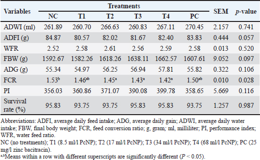 Carcass traitsAt the end of the experiment (28 days), 36 chickens (6 chickens per treatment, 1 chicken per replicate) with FBW close to the median for each group were selected, weighed, and slaughtered using the halal method by decapitation and cutting the neck blood vessels for carcass assessment. Before the slaughter day, the chickens were fasted from feed, but water was still provided. The slaughtered chickens were briefly boiled at 65°C for 1 minute, dried, and then plucked. After the internal organs were plucked and removed, the neck, head, and feet were removed manually. The abdominal fat was collected and weighed. The carcass weight is used to determine the yield percentage. The carcass is then cut into commercial cuts, including the breast, thigh, drumstick, and wing, each of which is weighed. The percentage is defined as the carcass weight relative to the live weight multiplied by 100% (Chaiwang et al., 2023). Digestive characteristicsA total of 36 chickens were used (n=36), with 6 chickens per treatment and 1 chicken per replicate. All digestive organ weights were measured using an electronic balance (Mettler-Toledo GmbH, Greifensee, Switzerland) after being emptied of contents. The esophagus, crop, proventriculus, gizzard, duodenum, jejunum, ileum, colon, cecum, and pancreas were measured. Organ weights were expressed as relative weights, which were calculated as organ weight divided by live body weight. The length of each intestinal segment was measured to the nearest 1 mm using a tape measure (Huang et al., 2022). The length of the small intestine was calculated according to the segments: duodenum (part of the small intestine between the gizzard and the bile duct junction), jejunum (up to Meckel's diverticulum), and ileum (between Meckel᾽s diverticulum and the ileocecal junction) (Farkas et al., 2025). The lengths of the colon and large intestine were also measured. The pH of each digestive part (duodenum, jejunum, and ileum) was determined from fresh intestinal samples using a YY1030 semisolid pH meter (Yinmik, Shandong, China). The acidity was measured at three different points within each organ, and the average of these pH readings was recorded as the acidity value. The pH meter was calibrated with pH 4 and pH 7 buffer standards and rinsed with distilled water before use. Jejunum histomorphometryAfter the experiment, one bird per replicate was randomly selected for jejunum sampling. Samples were fixed in 10% formalin–saline solution (Abdel-Moneim et al., 2025). Sections measuring 4–5 μm in thickness were prepared using a Leica RM2255 rotary microtome (Leica Biosystems, Nussloch, Germany) and stained with hematoxylin and eosin for morphometric evaluation under light microscopy (Daneshmand et al., 2017). Villus height, villus width, apical width, and crypt depth were measured using Optilab Viewer 4 image analysis software (Miconos, Yogyakarta, Indonesia). Five well-oriented villi and their associated crypts were selected from five intestinal cross-sections for each sample. Images of the villi were captured at 40x magnification and analyzed using Image Raster 3 software (Miconos, Yogyakarta, Indonesia). The experiment used 36 chickens (n=36), distributed into treatments at a rate of 6 birds per treatment, with one bird representing each replicate. The average of the measurements was used as the basis for further analysis (Abdelhady et al., 2021). Statistical analysisThe collected data were analyzed using analysis of variance in a completely randomized design with SPSS Statistics software version 29.0. One-way analysis of variance was used to evaluate treatment effects, and differences between group means were assessed using Duncan’s post hoc test, with significance set at P ≤ 0.05. The statistical model applied was as follows: Yij=π + Ti + eij Yij represents the value of the concerned treatment, π is the mean for the concerned treatment, Ti is the fixed effect of the treatments, and eij is the random error. Ethical approvalThis study was conducted at the Faculty of Animal Science, Universitas Gadjah Mada, Yogyakarta, Indonesia, from July to October 2024. All experimental procedures involving animals were reviewed and approved by the Research Ethics Committee of the Faculty of Veterinary Medicine, Universitas Gadjah Mada (Approval No. 67/EC-FKH/int./2024) and were performed in strict accordance with the Guidelines for the Care and Use of Laboratory Animals. ResultsGrowth performanceThe effects of PcNP supplementation on broiler growth performance are presented in Table 3. PcNP supplementation at a dose of 17 ml/l provided the best FCR value in broiler chickens compared with the control group (P < 0.05). However, ADWI, ADFI, WFR, ADG, PI, and survival rate were not significantly affected by the inclusion of PcNP in drinking water. Table 3. Growth performance of broiler chickens supplemented with nanoencapsulated Peronema canescens Jack leaf extract in drinking water.
