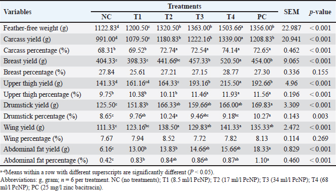 Carcass and carcass percentageResults in Table 4 showed the impacts of PcNP supplementation on carcass yield and percentage. Adding PcNP to drinking water at 68 ml/l resulted in the greatest feather-free weight, carcass yield, breast yield, and upper thigh yield compared to other groups (P < 0.001). Wing yield increased with PcNP supplementation at 17 and 68 ml/l of PcNP (P < 0.001). Supplementation of 34 and 68 ml/l PcNP showed increased upper thigh yield similar to the administration of 25 mg/l zinc bacitracin (P < 0.001). A different trend was observed in carcass percentage, which was higher at a dosage of 25 mg/l and PcNP at a dosage of 17 ml/l, and higher than that in chickens that were not treated and received the lowest dosage of PcNP (P < 0.001). Administration of 17 and 68 ml/l PcNP increased wing yield compared with other treatments (P < 0.001). Drumstick per increased with PcNP supplementation at 17 ml/l and 25 mg/l zinc bacitracin (P < 0.001). Administration of antibiotics (25 mg/l zinc bacitracin) resulted in higher drumstick yield, abdominal fat yield, and abdominal fat percentage (P < 0.001). In contrast, the breast and wing percentages were not affected by PcNP treatment. Table 4. Carcass weight and yield of broiler chickens supplemented with nanoencapsulated Peronema canescens Jack leaf extract in drinking water.