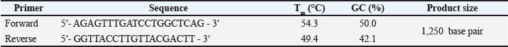 Fig. 1. 16SrRNA gene (15,00 bp) amplified PCR products: Agarose gel electrophoresis, 1.5% agarose, ethidium bromide staining, and 1.30 hours of electrophoresis at 5 volt/cm2.