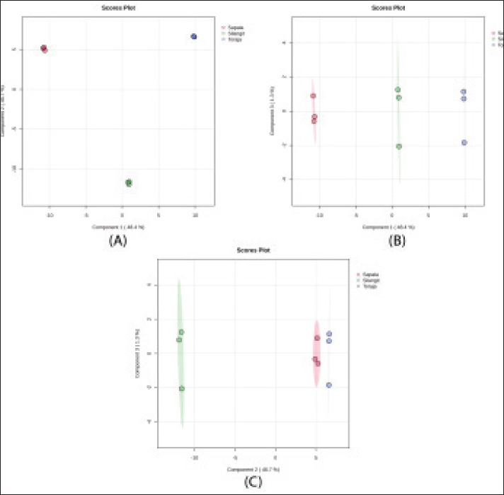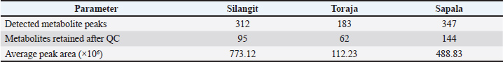 Fig. 2. PLS-DA analysis of sperm metabolomic profiles in Indonesian buffalo breeds. (A) Component 1 versus. Component 2, (B) Component 1 versus. Component 3, and (C) Component 2 versus. Component 3. Table 2. Summary of detected and quality-controlled sperm metabolite features in Indonesian buffalo.