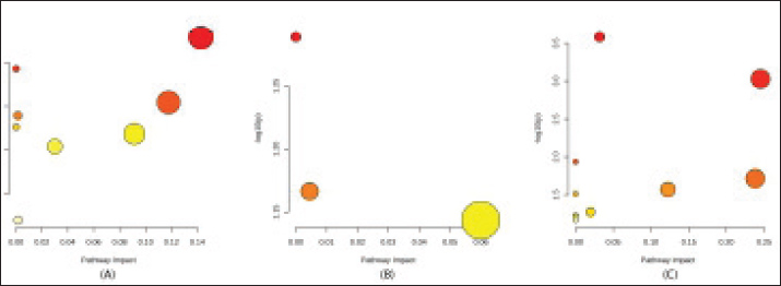 Fig. 5. Pathway enrichment analysis of differential sperm metabolites in Indonesian buffalo breeds: Silangit (A), Toraja (B), and Sapala (C). Table 4. Pathway enrichment analysis of differentially expressed sperm metabolites in Indonesian buffalo.