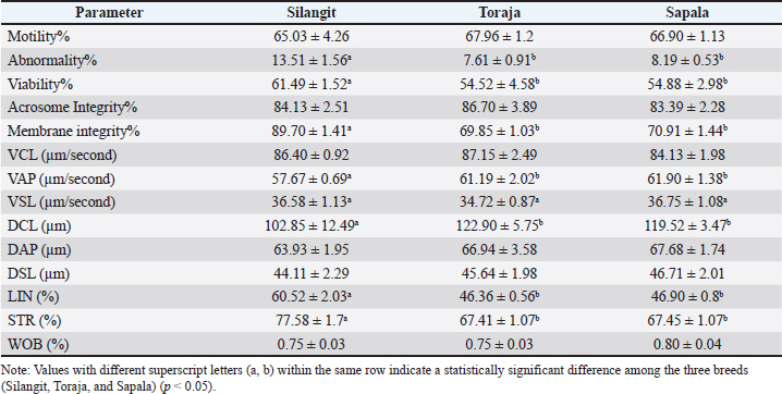 AbstractBackground: The increasing demand for animal protein in Indonesia underscores the importance of improving the productivity of indigenous buffalo breeds, which remain underutilized. Semen quality plays a central role in the success of artificial insemination, and metabolomic profiling provides opportunities to uncover the molecular mechanisms underlying fertility. Aim: This study aimed to investigate the association between post-thawed sperm quality and metabolomic signatures of three Indonesian buffalo breeds (Silangit, Toraja, and Sapala) to identify breed-specific biomarkers associated with fertility potential. Methods: Semen samples were collected from healthy bulls (5–8 years old, 450–750 kg) maintained under standardized management conditions. Using computer-assisted sperm analysis, post-thawed semen quality was evaluated for motility, viability, morph abnormality, acrosome and membrane integrity, and kinematic parameters. Metabolomic profiling was performed using high-resolution liquid chromatography-high-resolution mass spectrometry, and data were analyzed using multivariate statistics, pathway enrichment, and receiver operating characteristic (ROC) curve analysis for biomarker evaluation. Results: Significant breed-dependent differences in semen quality and metabolomic composition were observed. The Silangit bulls showed higher sperm viability and membrane integrity, whereas the Toraja and Sapala bulls exhibited lower morph abnormality rates. Distinct discriminative metabolites were identified across breeds: oxalacetic acid and adenosine in Silangit, dimethylethanolamine and uridine in Toraja, and glutamic acid with succinic acid semialdehyde in Sapala. Pathway enrichment analysis revealed energy metabolism predominance in Silangit, membrane remodeling and DNA stability in Toraja, and antioxidative mechanisms in Sapala. Receiver operating characteristic analysis confirmed the diagnostic potential of these metabolites as candidate biomarkers. Conclusion: Semen quality and metabolomic data reveal breed-specific adaptations to cryopreservation in Indonesian buffalo, guiding fertility prediction, improving cryopreservation, and selective breeding to sustain indigenous genetic resources. Keywords: Cryopreservation, Fertility prediction, Indigenous genetic resources, Seminal plasma, Metabolomic profiles. IntroductionThe global demand for animal protein is projected to increase by 60%–70% by 2050, increasing the pressure on food systems (Makkar, 2018; Henchion et al., 2021). Indonesia’s reliance on cattle, poultry, and fish creates a supply–demand gap that motivates diversification (Anindita et al., 2020; Said 2020; Sari et al., 2021). The indigenous buffaloes, such as Toraja, Sapala, and Silangit, remain underutilized despite local adaptation (resilience, disease tolerance, and marginal-forage use) and potential to contribute to the national protein supply (Suhardi et al., 2022; Tsuji et al., 2022; Azwar et al., 2024). These considerations underscore the urgent need to optimize productivity, particularly reproductive efficiency, in buffalo populations from Toraja, South Kalimantan, and Sumatra (Prihandini et al., 2023). This targeted improvement will diversify protein sources and strengthen national food security through a resilient, sustainable domestic supply. Reproductive efficiency, especially semen quality, underpins AI success (Zuidema et al., 2021). However, local buffalo breeds show variable semen quality and remain understudied (Chen and Huang, 2024). Metabolomics can elucidate pathways underlying semen quality and fertility, offering mechanistic insight (Talluri et al., 2022; Mateo-Otero, 2024). However, integrated studies linking buffalo semen quality with metabolomic profiles are scarce, and implications for food security strategies remain unclear (Martínez et al., 2025). This gap highlights the need for more focused research to optimize reproductive technologies in buffalo, which could have important impacts on livestock productivity and sustainability. Enhancing buffalo productivity can expand animal-protein supply, reduce reliance on a narrow set of species, and strengthen food security (Prihandini et al., 2023). This study aimed to characterize post-thaw sperm quality and metabolomic profiles in local Indonesian buffaloes and identify candidate metabolites correlated with semen quality indices of cryotolerance as hypothesis-generating biomarkers for future validation against fertility outcomes. Materials and MethodsAnimal sources and study locationsThis study was conducted during the dry season between June and August 2025. This study involved three local Indonesian buffalo (Bubalus bubalis) breeds, namely, Toraja buffalo (South Sulawesi), Sapala buffalo, and Silangit buffalo (North Sumatra), with n=3 bulls per breed (total n=9). All bulls were 5–8 years old and weighed between 450 and 750 kg. Animals were maintained under standardized management conditions and monitored by veterinarians to ensure their health status. Feed management was standardized across sites (forage-based ration plus concentrate, mineral–vitamin supplementation, and water ad libitum). The experimental animals were kept at the following institutions: the Technical Implementation Unit for Artificial Insemination and Semen Production, South Sulawesi Provincial Livestock and Animal Health Service (−5.15223, 119.67831); the Artificial Insemination Center, South Kalimantan Provincial Plantation and Livestock Service (−3.44472, 114.81590); and the Siborongborong Superior Livestock Breeding and Forage Center, North Tapanuli Regency, North Sumatra (2.26654, 99.002533). Semen was collected once per week per bull using an artificial vagina (38°C–42°C) under uniform hygiene and handling. The same commercial extender (Andromed®, Minitube, Germany) was used for all ejaculates/breeds. For cryopreservation, the diluted semen was cooled gradually to 5°C, equilibrated for 2–4 hours