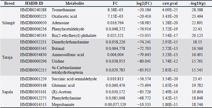Fig. 4. Top 5 differential sperm metabolites in Indonesian buffalo breeds based on Variable Importance in Projection scores and volcano plots. (A) Silangit, (B) Toraja, and (C) Sapala. Table 3. Top 5 differential sperm metabolites in Indonesian buffalo breeds.