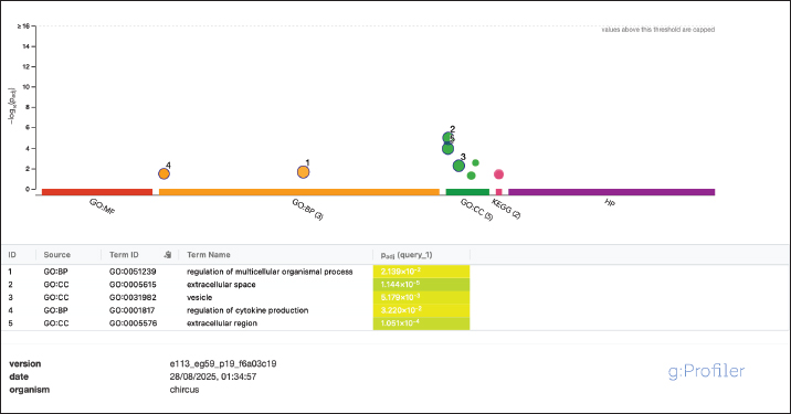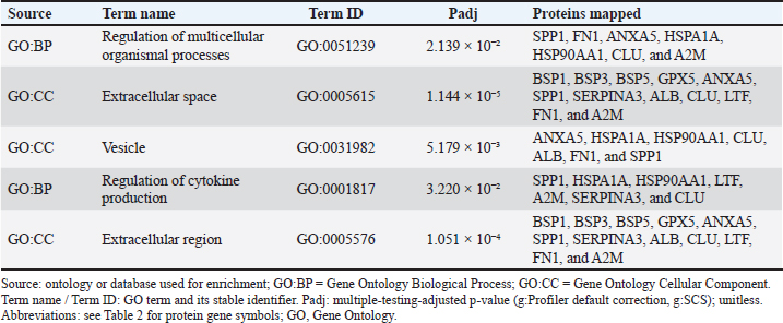 Fig. 2. Functional enrichment of the seminal-plasma protein in Saanen bucks. adjusted P values (Padj) are FDR-corrected (g:Profiler; species Capra hircus; default background). Table 3. Functional enrichment of the seminal-plasma protein in Saanen bucks.