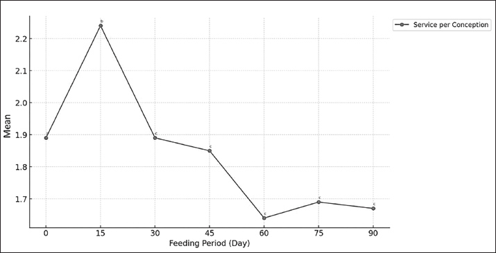 Fig. 5. Hormone level in Garut rams during Azolla Pinnata feeding periods; different superscript letters in the same line indicate significant differences at p < 0.05. Reproductive capacity in Garut rams during the feeding period of Azolla pinnataAs detailed in Figure 6, the reproductive ability, as indicated by the Service per Conception, is defined as the average number of inseminations required for an ewe to become pregnant. A total of 12 ewes were used for fertility testing, and the S/C value represents the mean fertility response corresponding to semen from each sampling period, which was monitored over a 90-day feeding period involving A. pinnata. The graph demonstrates significant differences (p < 0.05), as indicated by distinct superscripts on the same line. The service per conception value reached its highest level around day 15, with an average of approximately 2.2, which was notably higher than the values observed at later time points. On day 30, a consistent decline was recorded, with significant differences between day 15 and the subsequent days. The lowest values were observed on days 60, 75, and 90, indicating a reduction in SPC as the feeding duration progressed.