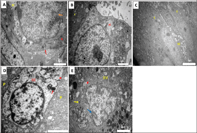 Fig. 3. Transmission electron micrographs of the epididymal duct in Meriz bucks during the autumn season (October). (A) Cauda (distal): Basal cell (BC), notch (orange arrow), and basal plasma membrane Folding (red arrowhead), and basal lamina (red arrow); scale bar=2 µm. (B) Proximal corpus: Apical cell (AC) and principal cell (P); scale bar=2 µm. (C) Caput (initial): Narrow cell (NC) and principal cells (P). Scale bar=5 µm. (D) Cauda (proximal): CC, principal cells (P), C-shaped vesicles (red arrowhead), and dense bodies (red arrow). Scale bar=2 µm. (E) Corpus (distal): IEM, notches (blue arrows), pseudopodia (red arrowhead) and lysosomes (yellow arrow); scale bar=2 µm.