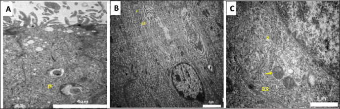 Fig. 4. Transmission electron micrograph of Meriz bucks epididymal duct (A) Winter—Middle corpus: principal cells (P); scale bar=4 µm. (B) Spring—Initial caput: principal cells (P) and Golgi apparatus (GA); scale bar=4 µm. ( C) Summer Distal corpus: a principal cell (P), mitochondria (yellow arrow), and rough endoplasmic reticulum (RER); scale bar=1 µm. Immunohistochemical findingsA-Alpha-smooth muscle actin (α-SMA)Throughout the mating and non-mating seasons. The peritubular muscular layer and smooth muscle cells surrounding blood vessels had α-SMA positivity throughout the ED, including the first segment of the caput (Fig. 5A–D). corpus segments (Fig. 6A–D) and both cauda segments (Fig. 6 E–H). During the breeding season, α-SMA expression was higher than that in the previous seasons. Nevertheless, throughout the length of the ED in every season, negative expression was observed in the epithelial cells, including PCs, BCs, ACS, CCs, IELs, and IEMs (Figs. 5 and 6).