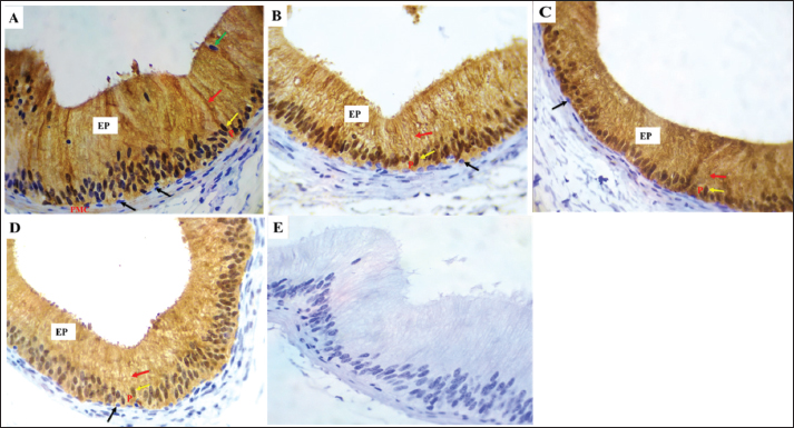 Fig. 7. S-100 expression in the first part of the caput showing A: Strong immunoreactivity in the epithelium (EP), principal cells (P), cytoplasm (red arrows), and nucleus (yellow arrows) Apical cells (green arrows), basal cells (black arrows), and the PMC During the mating season. However, weak S-100 expression was observed during non-mating seasons (B–D), Negative controls IgG (E). Magnification:40 ×, scale bar=20 µm.