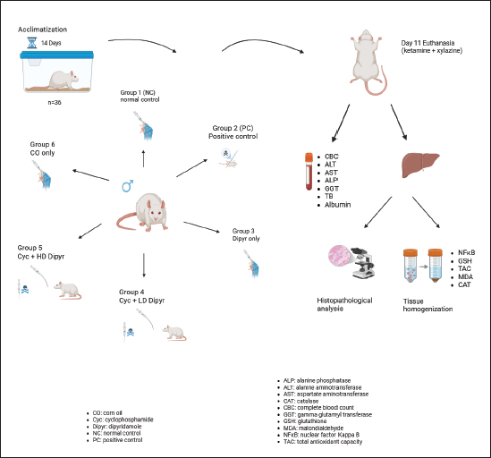 Fig. 1. Experimental design of the study. Group 1 received 0.1 ml of normal saline. Group 2 was treated with Cyc at 200 mg/kg on the ninth day. Group 3 received a dose of 30 mg/kg Dipyr for ten days. Group 4 received an oral dose of 15 mg/kg Dipyr for ten days with Cyc 200 mg/kg injection on the ninth day. Group 5 received an oral dose of 30 mg/kg Dipyr for ten days with Cyc 200 mg/kg injection on the ninth day. Group 6 served as the control group for corn oil.. Animal euthanasia and organ collectionOn the eleventh day of the experiment, the rats were anesthetized by a 0.4 ml combination of ketamine (100 mg/ml manufactured by Doga Ilac, Türkiye) and xylazine (20 mg/ml, manufactured by Beltavetpharma, Türkiye). The final solution of ketamine/xylazine contained ketamine at a rate of 33.3 mg/ml and xylazine at 6.7 mg/ml, and it was injected at a rate of 3 ml/kg. After that, the chest cavity was opened, and the animals were sacrificed by exsanguination. The collected blood was divided into two tubes for complete blood count and biochemical analyses. Then, the peritoneal cavity was opened, and the liver was collected and flushed with 0.9% NaCl solution. The livers were weighed on a sensitive balance, and 2 g of tissue was excised for homogenization by mixing with 18 ml of phosphate-buffered saline (PBS), homogenizing with a mechanical homogenizer, and then centrifuging in a cold centrifuge. The supernatant was then transferred to a separate Eppendorf tube and stored at −80 ºC until used to measure OS, antioxidants, and immunological biomarkers. The remaining liver tissue was placed in 10% formalin for histopathological processing. Body/liver weight measurementsThe rats’ body weights were measured using a digital balance on days 1, 9, and 11 during the experiment. Additionally, the freshly excised livers of sacrificed animals were weighed after washing in 0.9% NaCl solution and drying with medical gauze to determine the liver-to-body weight ratio. Biochemical analysisThe serum samples were centrifuged with a microcentrifuge (Hettich Zentrifugen EBA20, Germany). Then, serum levels of alanine transaminase (ALT), aspartate transaminase (AST), alkaline phosphatase (ALP), gamma-glutamyl transferase (GGT), total bilirubin (TB), and albumin were measured. The above-mentioned parameters were measured with Cobas C 311 (Roche/Hitachi, Switzerland). Assessment of hepatic oxidative stress and antioxidant biomarkersThe MDA (malondialdehyde) ELISA Kit was used to measure MDA levels in liver tissue. Additionally, the Rat TAC ELISA kit was used to measure TAC in liver tissue. This test helps evaluate the liver’s ability to counteract OS by neutralizing free radicals. Moreover, the Rat Glutathione (GSH) ELISA Kit was used to measure GSH levels in the liver. Furthermore, the Rat Catalase ELISA Kit was used to measure catalase enzyme levels. All kits were manufactured by Bioassay Technology Laboratory (China), and the procedures were conducted according to the manufacturer’s instructions. Measuring the nuclear factor kappa B (NF-κB) levels in the liverThe Rat Nuclear Factor Kappa B (NF-κB) ELISA kit, manufactured by Bioassay Technology Laboratory (China), was used to measure NF-κB activation levels in the liver tissue, which play a critical role in inflammation, immune response, OS, and liver disease progression. The procedure was conducted following the manufacturer’s instructions. Hematological analysisThe automated Mindray Auto Hematology Analyzer BC-2800Vet (Shenzhen Mindray Biomedical Electronics Co., Ltd., China) was used to measure hematological parameters, such as total and differential leukocyte counts, erythrocyte and thrombocyte counts, hemoglobin concentration, hematocrit, mean corpuscular volume (MCV), mean corpuscular hemoglobin (MCH), and mean corpuscular hemoglobin concentration (MCHC). Histopathological procedureThe histopathological protocol used was based on a procedure from a previous study (Arsad et al., 2014). The liver tissue was allowed to fix for more than 48 hours, as was recommended by previous studies (Ming et al., 2021). The liver samples were placed in 10% formalin and then dehydrated through a gradual increase in ethanol concentration (70%, 80%, 90%, and 100%), washed, and cleared in xylol. They were subsequently rehydrated and embedded in paraffin. Then, 5-µm-thick sections were stained with hematoxylin and eosin (H&E), cover-slipped, and examined under a standard light microscope (Motic, Japan) at various magnifications. The hepatic tissue was assessed for changes in architecture, portal triads, hepatocytes, sinusoids, inflammation, and the occurrence of degeneration, necrosis, and fatty change. The alterations were classified into the following categories: Grade 0: Unremarkable histological findings (0%); Grade 1: Mild change involving up to 25%, initiation of change; Grade 2: Moderate change involving 26–50%; Grade 3: Moderate-severe change involving 51–75%; and Grade 4: Severe change involving >75%, widespread changes identified (Hassan et al., 2022). The following lesions were considered during the histopathological examination: Swelling of hepatocytes, hydropic degeneration, congestion of central veins, congestion of portal veins, congestion of sinusoidal capillaries, and the degree of inflammation. Statistical analysisThe data of the results were expressed as the mean ± SEM. A one-way analysis of variance (ANOVA) was used to analyze parametric data, followed by Duncan’s post hoc test; the Kruskal-Wallis test was used for nonparametric data. A probability level of 0.05 was considered to determine significant differences. Ethical approvalThe College of Veterinary Medicine, University of Sulaimani, approved the study protocol through the approval number AUP-2024-32. ResultsAnimal and liver weightsThe weight of rats on day 1 of the study ranged from 194.2 g to 211.8 g, with no significant differences between the groups (Fig. 2). By day 9, their weights i