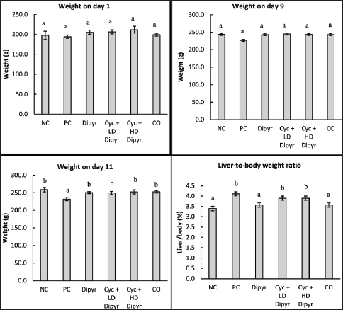 Fig. 2. Body weights on days 1, 9, and 11 of the study, as well as liver-to-body weight ratios across the different experimental groups on day 11 of the study. Data are presented as mean ± SEM (n=6 per group). Error bars labeled with different letters (a, b, c) indicate statistically significant differences at p < 0.05, as determined by one-way ANOVA followed by Duncan’s post hoc test. The liver-to-body weight ratios in the three Cyc-treated groups were significantly higher than those in the NC, Dipyr, and CO groups (Fig. 2). This increase in the liver-to-body weight ratio in the Cyc-treated groups indicates acute hepatotoxicity. However, the liver-to-body weight ratio in the groups treated with Cyc + Dipyr remained significantly higher than in the other NC, Dipyr, and CO groups, suggesting that coadministration of Dipyr with Cyc had only a limited effect on Cyc-induced hepatomegaly. Hematological parametersThe total leukocyte count decreased drastically in the Cyc-treated groups from the baseline of 9.8 × 103 leukocytes/µL in the NC (Table 1). The differential leukocyte count revealed that the leukocytopenia following Cyc treatment was primarily due to a decrease in lymphocyte counts. These findings indicate that Cyc treatment induces marked leukocytopenia, primarily through lymphocyte depletion, whereas Dipyr treatment did not prevent leukocytopenia. Table 1. Total and differential leukocyte profiles across experimental groups.