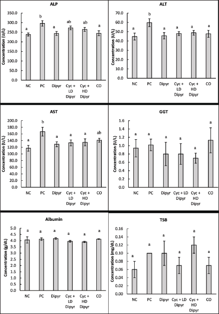 Liver function biomarkers in serumThe serum concentrations of ALP, ALT, AST, GGT, albumin, and TSB were compared statistically among the groups, and the results are shown in Figure 3. Cyc administration in the PC group caused significant hepatic injury, evidenced by elevated serum ALP, ALT, and AST levels compared with the others. On the other hand, coadministration of Dipyr with Cyc in groups 4 and 5 lowered the concentrations of these enzymes to near normal levels observed in the NC group rats. However, GGT, albumin, and total serum bilirubin levels were not affected by the treatments, showing no significant differences among the groups.