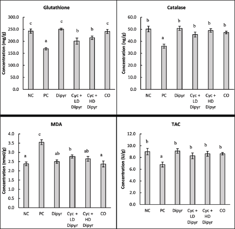 Fig. 4. Levels of glutathione, catalase, MDA, and TAC in the hepatic tissue. Values represent the means of six rats per group (columns) ± SEM (error bars). Different letters (a, b, c) denote significant differences between the groups at p < 0.05, as determined by one-way ANOVA followed by Duncan’s post hoc test. Dipyr alone maintained GSH, CAT, TAC, and MDA at levels comparable to the NC, suggesting intrinsic antioxidant activity without inducing OS. Moreover, the CO group showed no significant differences from NC in any parameter, confirming that the vehicle had no adverse impact. Overall, the results demonstrated that Cyc administration enhanced marked OS, evidenced by decreased GSH, CAT, and TAC levels, alongside elevated MDA levels. Dipyr coadministration counteracted these changes in a dose-dependent manner, underscoring its antioxidant efficacy in palliating Cyc-induced oxidative damage. NF-κB levels in the hepatic tissueNF-κB levels in the PC group were 40% higher than baseline (3.22 ng/g) in the NC group, reflecting enhanced OS-driven inflammation. On the other hand, Dipyr coadministration significantly reduced NF-κB activation in a dose-dependent manner, restoring values to near-normal levels (Fig. 5). These outcomes imply that Dipyr exerts anti-inflammatory capabilities against Cyc-induced tissue damage, possibly by modulating redox-sensitive transcription pathways, such as NF-κB.