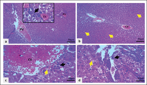 Fig. 10. Light microscopic sections of the liver in the Cyc + LD Dipyr group exhibited: a–d: Severe congestion of the central and portal veins, moderate congestion of sinusoidal capillaries (yellow arrows), moderate cellular swelling, and mild infiltration of neutrophils in centrilobular and perilobular regions, as in the inset and indicated by black arrows H&E stain). The administration of Dipyr with Cyc improved the liver lesions by reducing the pathologic scores. For example, the Cyc + LD Dipyr group was characterized by marked congestion of the hepatic vasculature with moderate hepatocytic swelling, with only a mild degree of inflammatory reaction (Fig. 10a–d). The combination of Cyc + HD Dipyr attenuated the alteration to moderate congestion of the central vein. At the same time, the portal vasculature remained intact, with mild congestion of sinusoidal capillaries and moderate cloudy swelling of liver cells without any evidence of inflammatory reactions (Fig. 11a–d). The histopathological lesion scores are illustrated in Figure 12.