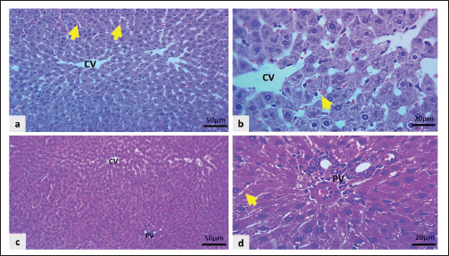 Fig. 8. Light microscopic section of the liver in the CO group showed: a and b: Uncongested central vein (CV) with mild sinusoidal congestion (black arrows), and hepatocytes swollen mildly (H&E stain). Rats in the CO showed mild hepatocyte swelling with a mild degree of congestion in the sinusoid, while the central vein and portal vein remained normal (Fig. 8a and b). The Cyc + HD Dipyr revealed focal congestion of the central vein. At the same time, the portal area remained normal, with mild congestion of sinusoidal capillaries and moderate swelling of hepatocytes. The hepatocytes were swollen and pale, looking like a cloud (Fig. 9a–d).