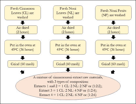 Ethical approvalAll research procedures involving animals were conducted in accordance with the ethical guidelines and regulations of The Ethics Committee of Universitas Perintis Indonesia (No. 1318/KEPK.F1/ETIK/2023). ResultsQuantitative analysis of phenols and flavonoids in Cinnamononi extractsTable 2 presents the quantitative analysis of phenol and flavonoid contents in the four types of cinnamon extracts. Extract 1 contained higher levels of phenols and flavonoids than Extract 2, although both were derived from the same raw material ratio (1:2:2; cinnamon:noni leaf:noni fruit). The difference was attributed to the drying method, as vacuum rotary evaporation (Extract 2) reduced the retention of phenolic and flavonoid compounds compared with oven drying (Extract 1). Extract 3 (1:2:4) exhibited higher phenol and flavonoid contents than Extracts 2 and 4. Effect of the treatment on broiler production performanceTable 3 shows broiler production performance when given four types of drying extracts and different raw material compositions. Broiler production performance is referred to here as FI, BWG, and FCR. The results of the analysis of variance showed that treatment had a highly significant effect (p ≤ 0.01) on BWG and a significant effect (p ≤ 0.05) on FCR, but no significant effect (p ≤ 0.05) on feed intake. After data analysis continued with the Duncan multiple range test (DMRT), BWG and FCR in broilers that received T1 treatment were not significantly different (p ≤ 0.05) from chickens that received T2 treatment. This shows that differences in drying techniques (namely, T1 with an oven and T2 with a vacuum rotary evaporator) at the same drying temperature (40°C–50°C) and the same raw material composition (1:2:2) do not affect BWG and FCR. The non-significant difference in BWG and FCR in broilers treated with T1 and T2 is thought to be due to the use of the same temperature, namely 40°C–50°C, so that it does not damage proxeronine and proxeroninase in the resulting extract. The DMRT results also showed that the weight gain of chickens from the T0 treatment (commercial diet; without extracts) was not significantly different (p ≤ 0.05) from the T3 (1:2:4, VRE) and T4 (1:2:6, VRE) treatments, but it was significantly higher (p ≤ 0.05) than the T1 (1:2:2, oven) and T2 (1:2:2, VRE) treatments. On the other hand, for the FCR variable, the FCR of chickens treated with T3 and T4 was significantly lower (p ≤ 0.05) than that of chickens treated with T1 and T2 but not significantly different (p ≤ 0.05) from that of chickens treated with T0. This shows that increasing the portion of noni fruit in the composition of extract raw materials (T3 and T4) does not affect feed intake but can increase body weight gain and reduce feed conversion ratio so that the response to increased production performance can match the performance of chickens fed commercial diets (T0). Table 2. Quantitative analysis of phytochemicals in four types of cinnamononi extracts.
