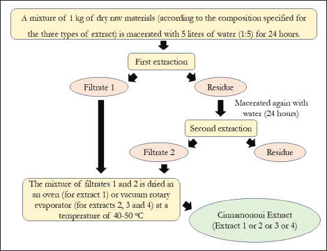 Fig. 2. Stage of maceration with water as the solvent. Animal trialA total of 100 unsexed broiler chickens (Arbor Acres, CP-707 strain; 21 days old) were randomly allocated into 20 cages (5 birds per cage). The experiment lasted for 14 days until the birds were slaughtered at 35 days of age. A completely randomized design was applied with five treatments and four replicates: T0 (commercial diet without extracts), T1 (basal diet + extract 1), T2 (basal diet + extract 2), T3 (basal diet + extract 3), and T4 (basal diet + extract 4). The basal diet was developed to be iso-nitrogenous and iso-caloric with the commercial diet (Table 1). The extracts were administered via drinking water at a concentration of 250 mg/kg body weight. Birds were fasted for 90 minutes before supplementation, received the extract solution until completely consumed, and then refasted for 30 minutes. Performance variables included FI, BWG, final body weight at day 35, FCR, carcass yield, and abdominal fat percentage. Statistical analysisAll data were analyzed by analysis of variance using the Statistical Package for the Social Sciences (IBM SPSS Version 22). Differences among means were compared using Duncan’s multiple range test. Table 1. Formulation and content of research diets.