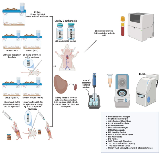 Fig. 1. The experimental design of the study. Animal euthanasia and blood and renal sample collectionOn day 9 of the experiment, each rat was weighed and euthanized by exsanguination after deep surgical anesthesia was induced by an intramuscular mixture of ketamine (100 mg/kg) and xylazine (20 mg/kg) (Mohammed-Rashid and Dyary, 2025). The chest cavity was opened, and blood was collected from the heart and placed into plain test tubes for serological analysis. The kidneys were soaked in normal saline, dried with sterile gauze, and weighed using a digital balance. The kidney-to-body weight (KBW) ratio was calculated as follows: KBW ratio=weight of both kidneys/Animal weight × 100. The kidney was homogenized in phosphate-buffered saline at a ratio of 1:9 and stored at −80°C for OS analysis, which involved measuring GSH, SOD, MDA, nuclear factor-kappa B (NF-κB), TAC, TOS, tumor necrosis factor-alpha (TNF-α), IL-1β, and nitric oxide (NO). Determination of biomarkers of renal functionSerum samples were centrifuged at 5,000 rpm for 15 minutes (Hettich Zentrifugen EBA20, Germany). The levels of blood urea nitrogen (BUN), uric acid (UA), and creatinine were measured using Cobas C 311 (Roche/Hitachi, Switzerland). Measurement of NAG urinary excretionUrine samples were collected over 24 hours before scarification of the rats using metabolic cages, and N-acetyl-β-D-glucosaminidase (NAG) activity was measured using the QuantiChrom™ β-N-Acetylglucosaminidase Assay Kit (Catalog No. DNAG-100, Bioassay Systems, USA) according to the manufacturer’s protocol. Analysis of renal OS and antioxidant biomarkersAn MDA ELISA Kit (Code: SH0020, Bioassay Technology Laboratory/China) was used to measure MDA in kidney tissue, an indicator of lipid peroxidation that serves as a marker of OS and cell membrane damage. A TAC Assay Kit (Code: SH0148, Bioassay Technology Laboratory/China) was used to test for TAC in kidney tissue. This test helps evaluate the ability of the kidneys to counteract OS by neutralizing free radicals. The total oxidant status (TOS) colorimetric assay kit (E-BC-K802-M; manufactured by Elabscience®) was used to measure the levels of oxidant molecules and the degree of OS in liver tissues. A Rat Glutathione, GSH ELISA Kit (Code EA0113Ra, Bioassay Technology Laboratory/China) was used to measure GSH, which is critical for antioxidant defense and detoxification. GSH assists in ROS neutralization, detoxifies harmful compounds, and protects against oxidative damage. A Rat Catalase ELISA Kit (Code: E0869Ra Bioassay Technology Laboratory/China) was used to measure CAT levels, which are crucial in the antioxidant defense system by changing hydrogen peroxide (H2O2) into H2O and O2, protecting against OS and damage. Moreover, a QuantiChrom™ Nitric Oxide Assay Kit (Catalog No. 50-489-194, Fisher Scientific) was used to measure renal tissue NO levels. All procedures were conducted according to the manufacturer’s instructions. Determination of IL-1β, TNF-α, and NF-κB in renal tissueA rat IL-1β ELISA kit (Code: E0119Ra, Bioassay Technology Laboratory/China) was used to measure IL-1β. Additionally, a TNF-alpha ELISA kit (Code: E0299Po; Bioassay Technology Laboratory/China) was used to measure TNF-α, an indicator of inflammation, cell death, and the immunological response. Moreover, a Rat NF-κB ELISA kit (Cat. No. E0287Ra, Imugex/Germany) was used to measure NF-κB activation level, a crucial factor in inflammation, immune response, OS, and disease progression. Statistical analysisThe data are shown as the mean ± SD. A one-way analysis of variance was used to test for overall differences, and Tukey’s post hoc test was used to identify significant differences between groups. Differences were analyzed as follows: A p-value of 0.05 was considered significant. GraphPad Prism software, version 10.5, was used for all statistical analyses. Ethical approvalThe study protocol was approved by the scientific and ethical committees of the College of Veterinary Medicine, University of Sulaimani (approval number AUP-2025). ResultsBody weight (BW) and kidney-to-BW ratiosOn day 9 of the experiment, the mean body weight of the rats in the NC group was 234.7 g, which was not significantly different from that of the other groups (p > 0.05; Fig. 2). The mean combined kidney weight in the NC group was 1.40 g, whereas the kidneys in the PC group weighed 5.7% more than those in the NC group, representing a statistically significant increase. Renal hypertrophy in the PC is probably an indication of AKI induced by MTX treatment. Kidney weights in the CoQ10-only treated group averaged 1.40 g, indicating that CoQ10 alone did not cause significant changes in kidney weight compared to the NC. Remarkably, the combined kidney weight in the CoQ10 + MTX-treated group averaged 1.42 g, suggesting that CoQ10 coadministration mitigated MTX-induced renal hypertrophy.