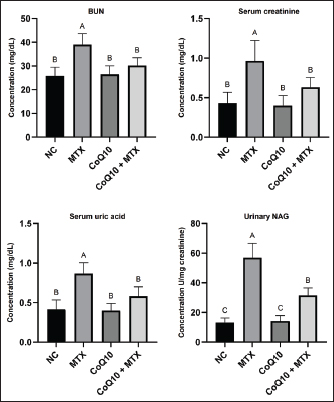 Fig. 3. BUN, creatinine, UA, and urinary NAG levels in the different experimental groups. Values are presented as mean (columns) ± SD (error bars) for six rats per group. Different uppercase letters indicate significant differences at p < 0.05. Serum creatinine levels in the NC group averaged 0.4 mg/dl, similar to those of the CoQ10-only group (0.4 mg/dl). In contrast, the PC group had a significantly higher concentration of 1.0 mg/dl than the other groups. This increase in serum creatinine levels in the PC indicates compromised renal function, even though the creatinine concentration did not reach toxic levels. Coadministration of CoQ10 lowered serum creatinine to 0.6 mg/dL, a value that was not significantly different from the NC (Fig. 3). These outcomes demonstrate that CoQ10 protects against MTX-induced renal impairment. Serum uric acid in the NC and CoQ10-only groups averaged 0.42 and 0.40 mg/dl, respectively, while the concentration significantly increased in the PC group to 0.87 mg/dl, probably reflecting reduced renal glomerular filtration rate. This finding further supports the notion that MTX induced nephrotoxicity in the PC group. Coadministration of CoQ10 resulted in a significantly lower uric acid concentration (0.58 mg/dl) compared to the PC group (Fig. 3), demonstrating CoQ10’s protective role against MTX-induced renal impairment. An elevated urinary NAG level, with a NAG concentration of 57.0 U/mg creatinine, is a marker of renal tubular injury, particularly proximal tubular injury, as observed in the PC group. This level was 4.35 times higher than the baseline NAG concentration of 13.1 and 14.2 U/mg creatinine in the NC and CoQ10-treated groups, respectively (Fig. 3). Co-treatment of MTX with CoQ10 in group 4 lowered the NAG concentration to 31.4 U/mg creatinine, which was significantly lower than that in the PC group, but it failed to return the concentration to baseline levels in the NC group. However, these findings highlighted the renoprotective impact of CoQ10 and demonstrated its mitigating effect on MTX-induced nephrotoxicity, probably through proximal tubular injury. Renal OS and antioxidant biomarkersThe average GSH level in the NC and CoQ10-treated groups was 60.9 and 60.2 µmol/g tissue, respectively, with no statistical differences between them. In contrast, the GSH concentration was reduced by 57.3% in the PC group, reaching 26.0 µmol/g (Fig. 4). This marked GSH depletion indicates severe OS induced by MTX exposure. Coadministration of CoQ10 with MTX in group 4 resulted in a GSH concentration of 43.8 µmol/g, which was significantly higher than that in the PC but lower than that in the NC. This result shows that CoQ10 partially reduced MTX-induced OS, although it was not sufficient to restore values to those of the NC.