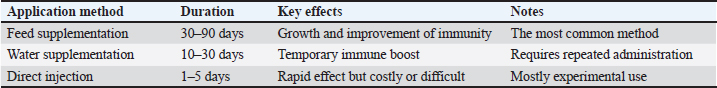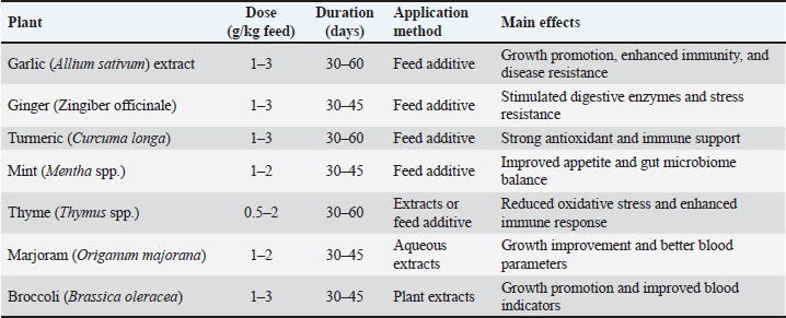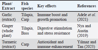 Studies have indicated that garlic extract contributes to immune system strength and growth promotion by improving gut microbiome health and physiological function (Valenzuela-Gutiérrez, 2021; Al-Hasson et al., 2025). Turmeric (Curcuma longa) and its active component curcumin have also drawn attention since 2017. Abdel-Tawwab et al. (2017) reported that curcumin supplementation at doses of 200–400 mg/kg was able to significantly enhance non-specific immunity and resistance to infection caused by Aeromonas hydrophila. Additional evidence corroborates the potent antioxidant effect of curcumin, reduction of oxidative stress, and ability to boost Nile tilapia production (Mahmoud et al., 2017; Al-Niaeem et al., 2025). Recent research has highlighted the potential of curcumin in red tilapia diet, improving growth, blood parameters, and liver function, thereby positioning it as a promising natural alternative to chemical stimulants (Radwan, 2024). Aromatic herbs such as thyme (Thymus spp.) have also been shown to be effective in fish health management. Active compounds such as carvacrol and thymol demonstrate improvement in immune response and reduction in oxidative stress when used in freshwater species such as trout and tilapia between 2018 and 2022. Low doses ranging from 0.5 to 2 g/kg were consistent in delivering stable results (Hafsan, 2022). Additionally, peppermint (Mentha spp.) has proven effective in enhancing appetite and stabilizing the intestinal microbiome, with recent findings highlighting improved growth rates and disease resistance following supplementation over a period of 30–45 days (Zahran, 2020). Studies on basil (Ocimum basilicum) emphasize its versatility in aquaculture applications. Eugenol-rich extract from basil has been shown to improve growth and immunity in trout, besides serving as a naturally sedative during fish transport, a beneficial trait for farm operations (Noorbakhsh, 2024). Similarly, coriander (Coriandrum sativum), known for its linalool content, has a notable advantage in enhancing the immune system and reducing bacterial infection in tilapia through dietary supplementation (Das et al., 2023; Said, 2023). Several studies (2019–2024) have shown that black seed (Nigella sativa) and its thymoquinone compounds play a prominent role in increasing immunity efficiency and reducing inflammation, while improving growth rates in different fish species (Alberts et al., 2024). Based on the above, the period between 2015 and 2025 witnessed an accumulation of knowledge about the importance of medicinal plants in aquaculture, with most studies agreeing that the optimal dosage ranges from 0.5 to 3 g/kg feed for 30–60 days. However, some variability in the results was due to differences in preparation and extraction methods, the fish species studied, and rearing conditions. Therefore, further long-term studies are needed to accurately determine the optimal dosages, standard preparation protocols, and chemical characteristics of extracts, especially in commercial production settings. In general, studies have concluded that whole medicinal plants and concentrated extracts have multifaceted positive effects on fish, including immunity, gut health, and growth. However, appropriate dosages must be selected to avoid toxic effects at higher concentrations. The results of recent studies also indicate that medicinal plants and extracts provide an effective and sustainable biological solution to improve fish health in aquaculture systems, as they combat pathogens, enhance innate immunity, improve digestion, reduce the need for antibiotics, and limit their associated health and environmental risks (Zahran, 2020; Tadese et al., 2021; Valenzuela-Gutiérrez, 2021; Yılmaz and Tan, 2023; Kadhim et al., 2023; Al-Turaihi and Al-Niaeem, 2024; Alberts et al., 2024; Radwan, 2024; Sumana et al., 2025; Abu-Zahra et al., 2025). However, there are clear differences in efficacy depending on the plant type, supplement form (whole plant or extract), concentration used, and target fish species. Concentrated extracts, such as curcumin and garlic, typically exhibit stronger immune-boosting effects, but they require careful dosage adjustment to avoid toxicity or side effects (Yılmaz and Tan, 2023). Factors affecting the use of plants and plant extracts as fish immunostimulantsRecent evidence indicates that the effectiveness of medicinal plants and plant extracts as nutritional and immunological additives in aquaculture largely depends on the plant variety, the plant type, the parts used, such as leaves, roots, or seeds, and the extraction method. These factors affect the concentration of active compounds and, consequently, the plant’s biological efficacy (Tables 4–8) (Dadras et al., 2023; Yılmaz and Tan, 2023). Determining the optimal dosage is essential for achieving the desired benefits, as excessive doses, especially when using concentrated extracts, can lead to toxic effects in fish (Chahardehi et al., 2020; Yılmaz and Tan, 2023; Grădinariu et al., 2025). Among the most prominent active compounds that play a pivotal role in stimulating the immune response and improving growth and disease resistance are allicin in garlic, curcumin in turmeric, and phenols and volatile oils in thyme (Tadese et al., 2021). These plants play an important role in improving the intestinal microbiome of fish by enhancing digestion efficiency, nutrient absorption, and overall digestive health (Syed Hasani, 2022). Plant extracts play a vital role in enhancing the non-specific immune response of fish by stimulating certain degradative enzymes, such as lysozyme, and boosting antioxidant molecules such as superoxide dismutase (SOD) and catalase (CAT). In addition, studies have shown that these extracts provide antioxidant effects that reduce the accumulation of free radicals and oxidative stress, thus supporting fish growth and improving their ability to cope with environmental and infection stresses. From an