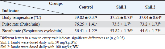 Physiological vital indicatorsThe Shil.2 group demonstrated significant physiological changes according to Table 4 because their body temperature and heart rate and respiratory rate all decreased. The body temperature of animals in the control group started at 39.82°C ± 0.37°C but Shil.2 treatment lowered it to 37.04°C ± 0.64°C which created more comfortable thermal conditions. Table 4. Effect of Shilajit concentrations on physiological vital indicators (Mean ± SE).