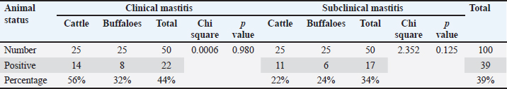 The difference in the prevalence of the detected pathogens in the investigated clinical and subclinical mastitis cases of both cattle and buffaloes may be attributed to the low sample size of the examined animals and different rearing locations, milking, and management practices.
