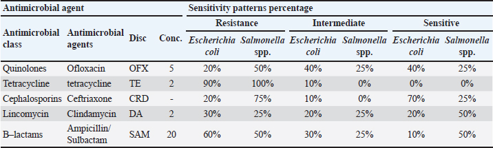 Concerning the randomly selected E. coli and Salmonella spp. antibiogram profiles, the findings revealed variable exhibited sensitivity and resistance patterns toward the five investigated antimicrobial groups, as shown in Table 3. The highest resistance rates for both E. coli (90%) and Salmonella spp. (100%) were exhibited toward TC antibiotics. Meanwhile, the highest exhibited sensitivity patterns were toward ceftriaxone (70%) and 50% for both clindamycin and ampicillin/sulbactam by E. coli and Salmonella spp., respectively. Precisely, the results of antibiograms are different between different pathogens within the same studies, as well as between various studies, and this may be attributed to the different methods used for antibiogram evaluation, which is considered unacceptable for adequate comparison (Schwarz et al., 2010).